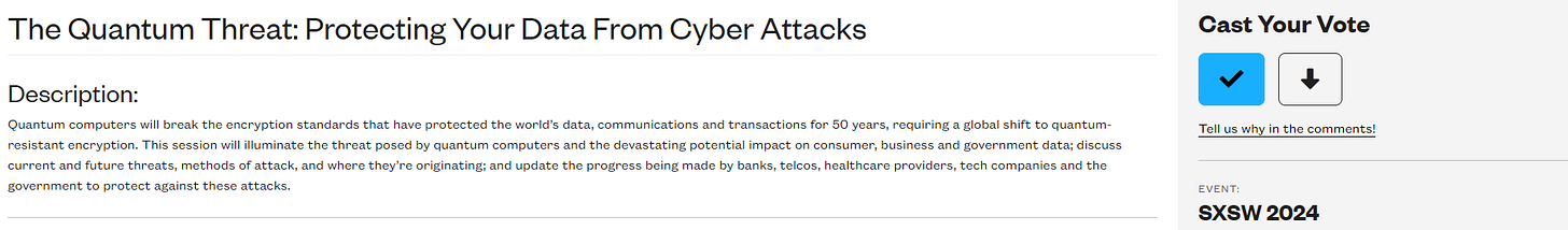 The SXSW (South by Southwest) Conference is about as different as The City Quantum Summit as an event could be, but we hope one thing will link them. Namely a discussion on the risks of quantum-enabled cyber attacks. While we prefer to focus on the positive sides of quantum this is a threat that can not be ignored and Sandbox AQ’s Fernando Dominguez Pinuaga explains this topic in an excellent way.